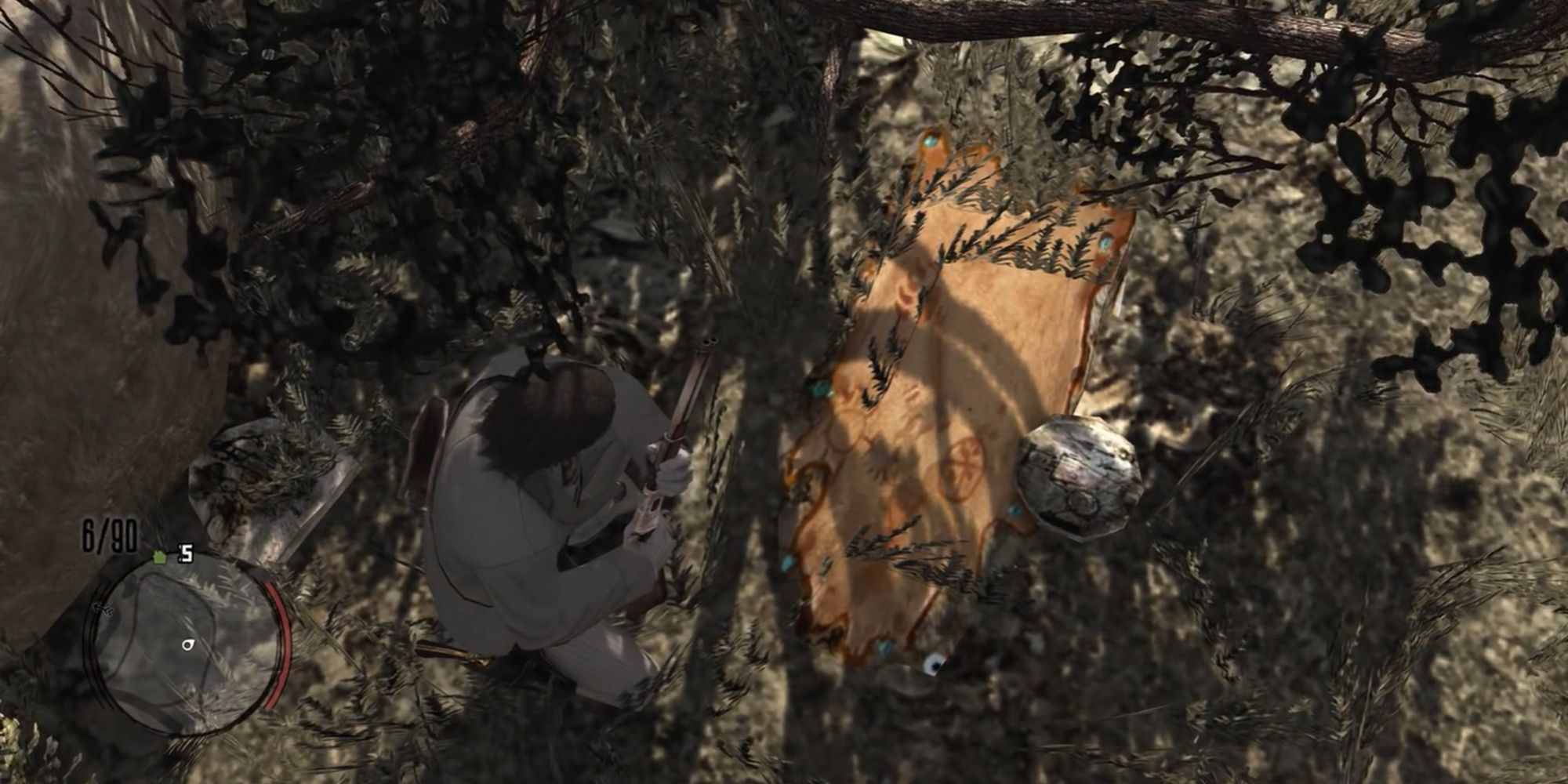 Вероятно, камни — это лазурит, и некоторые культуры верят, что этот материал соединяет физический и духовный миры. Любопытно, что шкура оленя, присутствовавшая в оригинальной игре, отсутствует в сиквеле, что указывает на важное событие, произошедшее в этом месте между 1907 и 1911 годами. Несмотря на эту подсказку, игроки до сих пор не смогли расшифровать её значение!