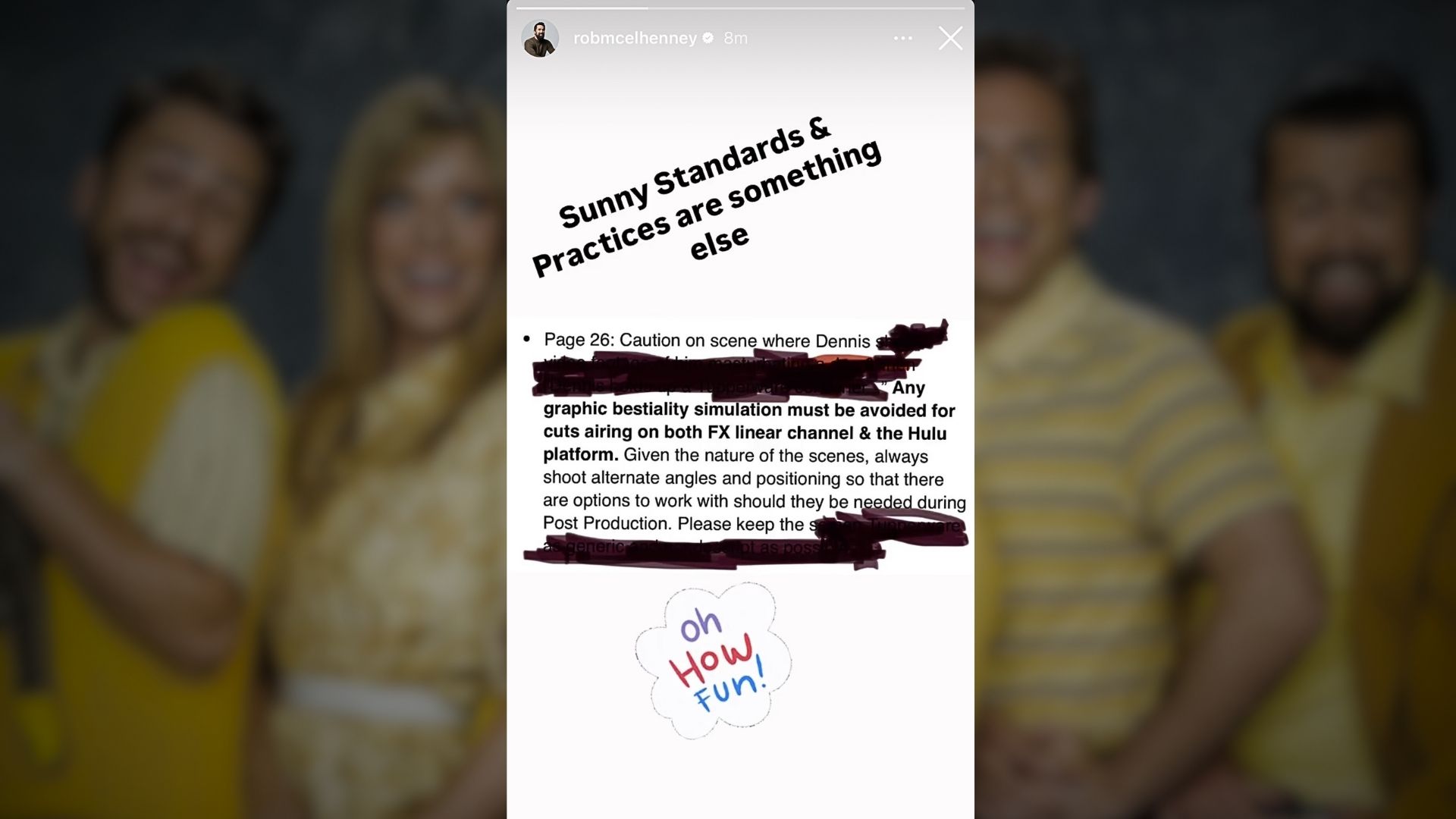 МакЭлхенни поделился в Instagram загадочным сообщением, исходящим от команды по стандартам и практикам 17-го сезона. В заметке предостерегается от включения любой «симуляции зоофилии», чтобы гарантировать, что эпизод сможет транслироваться на FXX. Хотя МакЭлхенни пытался скрыть детали с помощью цифрового маркера, зоркие поклонники «В Филадельфии всегда солнечно» быстро поняли содержание скрытой сцены с Деннисом Рейнольдсом. Зрителю настоятельно рекомендуется соблюдать осторожность, но, учитывая характер комедийного сериала, возможно, вы раньше слышали более откровенный контент. Вот что говорится в записке отдела стандартов и практики: